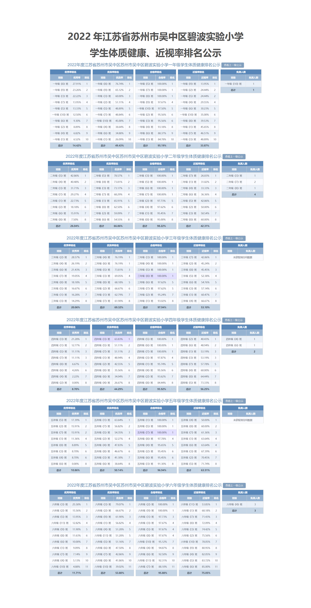 2022年江苏省苏州市吴中区碧波实验小学 学生体质健康、近视率排名公示